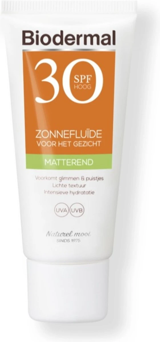 Biodermal gezicht matterende Zonnefluïde SPF 30 is speciaal ontwikkeld voor het gezicht. De zonnefluide bevat geavanceerde UVB-/UVA-filters voor een directe en aanhoudende bescherming.De lichte, zeer waterbestendige formule is matterend en laat geen glans achter op de huid. Bevat een combinatie aan ingrediënten die de huid hydrateert en puistjes helpt voorkomen. Deze zonnefluide is geschikt voor de normale tot gemengde huid en kan onder make-up aangebracht worden.