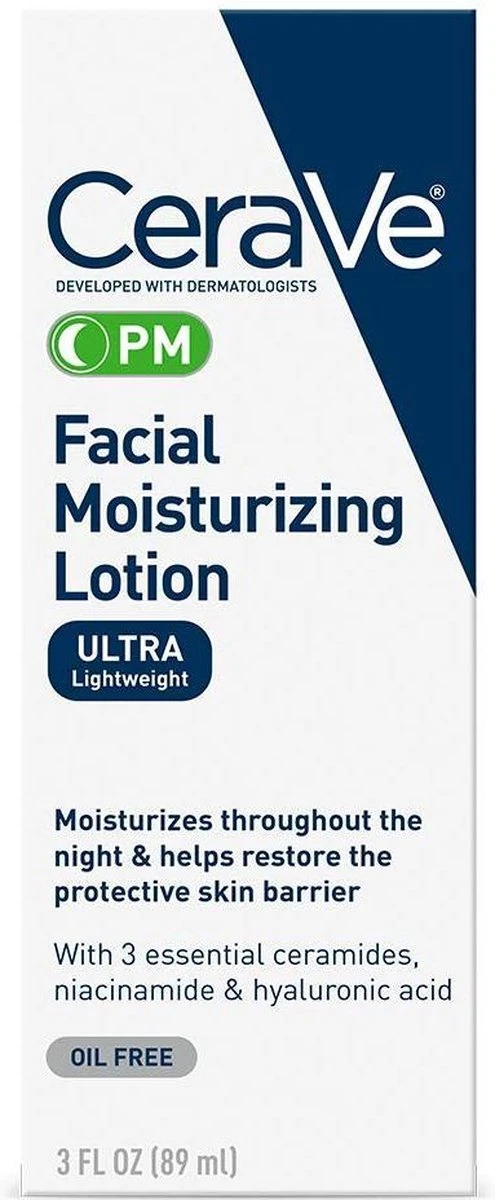 CeraVe PM Facial Moisturizer is gemaakt in samenwerking met dermatologen en bevat drie essentiële ceramiden, hyaluronzuur en niacinamide in een olievrije, niet-comedogene formule die de huid kan hydrateren en kalmeren en tegelijkertijd de natuurlijke barrière van de huid helpt herstellen. Deze rijke, maar lichtgewicht nachtcrème maakt gebruik van onze gepatenteerde MVE Delivery Technology om de hele nacht een gestage stroom van broodnodige hydratatie te leveren. Geschikt voor de normale tot vette huid.