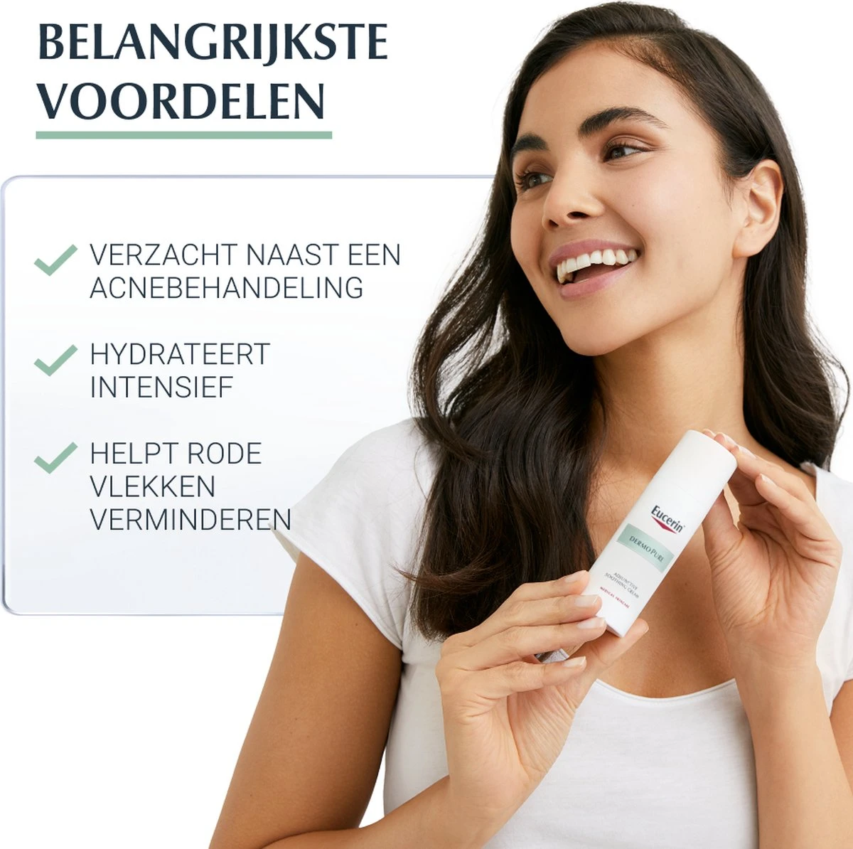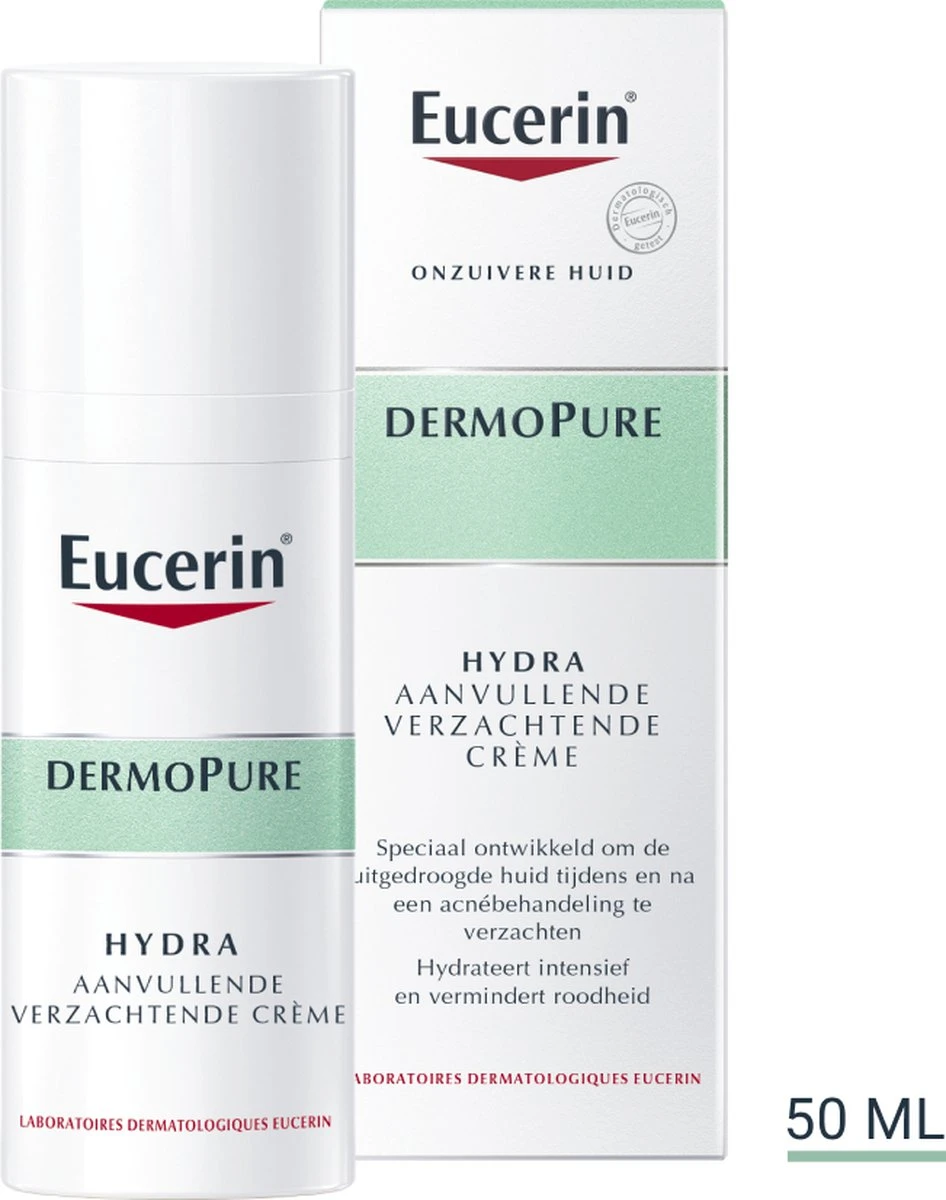 De Eucerin DermoPure Hydra kalmeert en biedt intense hydratatie aan een huid die medisch wordt behandeld voor acne. Het is een hydraterende crème voor de acnegevoelige huid die de (uitdrogende) bijwerkingen van acnemedicatie verlicht. Het product bestaat uit een intens hydraterende, niet-plakkerige formule die irritatie kalmeert, trekkerigheid vermindert en je zo helpt jouw onzuivere huid onder controle te houden.
