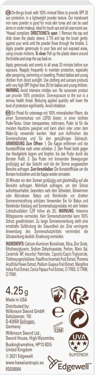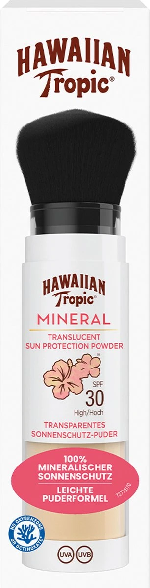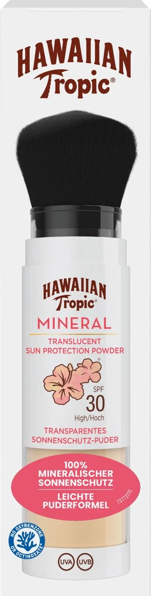 Hawaiian Tropic® Mineral Powder Brush SPF30 helpt je gezicht te beschermen tegen de zon. Met deze Mineral Powder Brush krijg je de dagelijkse bescherming en door de natuurlijke zeemineralen absorbeert het overtollige olie op je huid. De Mineral Powder Brush kun je op zichzelf gebruiken, onder je make-up of op je make-up om te fixeren. Gedurende dag kun je het eenvoudig opnieuw aanbrengen. De formule heeft een prachtige matte finish, biedt je UVA & UVB bescherming en is 100% mineraal.