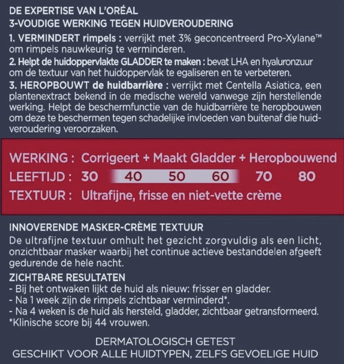 Deze anti-age nachtcrème heeft een drievoudige werking. Het vermindert rimpels, helpt het huid gladder te maken en stimuleert het herstel van de huid. De crème is verrijkt met hyaluronzuur en adenosine om rimpels te verminderen en het huidoppervlak te egaliseren en te verbeteren. De fijne textuur van deze masker-crème bevat actieve bestanddelen die gedurende de hele nacht werken op de huid. De anti-rimpel nachtcrème is verrijkt met Pro-Xylaan om rimpels nauwkeurig te verminderen. Ook wordt het steunweefsel in de huid versterkt, wat zorgt voor het opvullen van de huid. De nachtcrème is verrijkt met hyaluronzuur om de textuur van de huidoppervlakte te egaliseren en te verbeteren. Dit zorgt voor een zichtbaar jongere uitstraling. De toegevoegde Centella Asiatica helpt de beschermfunctie van de huidbarrière te heropbouwen om deze te beschermen tegen schadelijke invloeden van buitenaf. De Laser X3 nachtcrème is aanbevolen voor vrouwen vanaf 35 jaar.