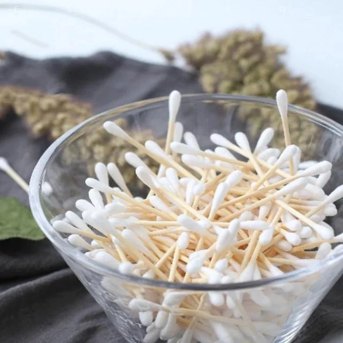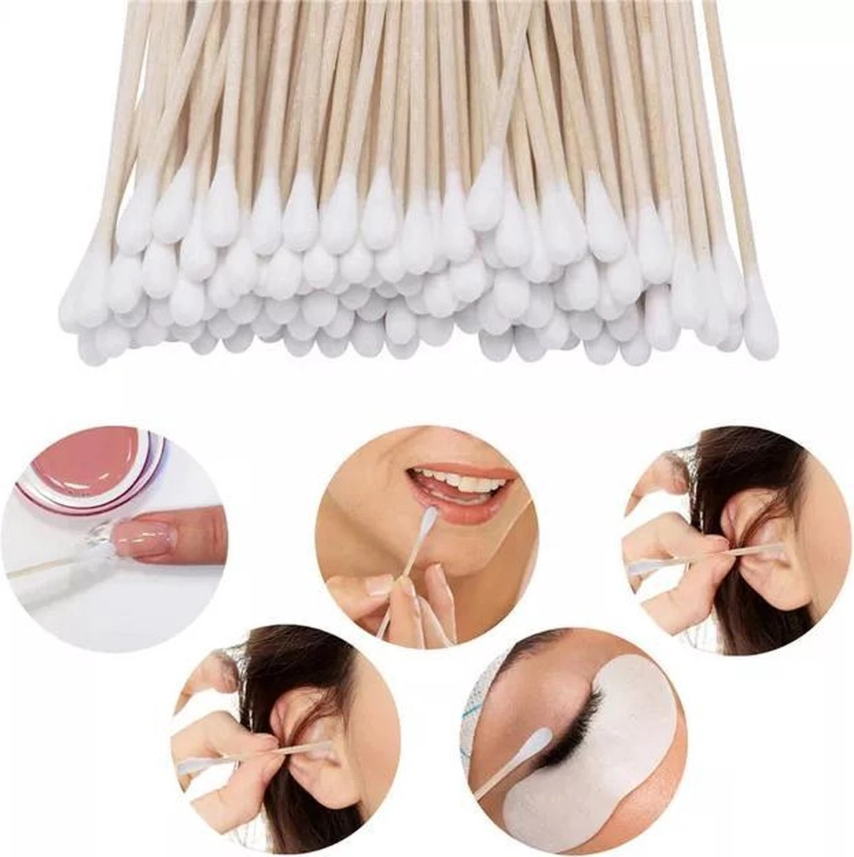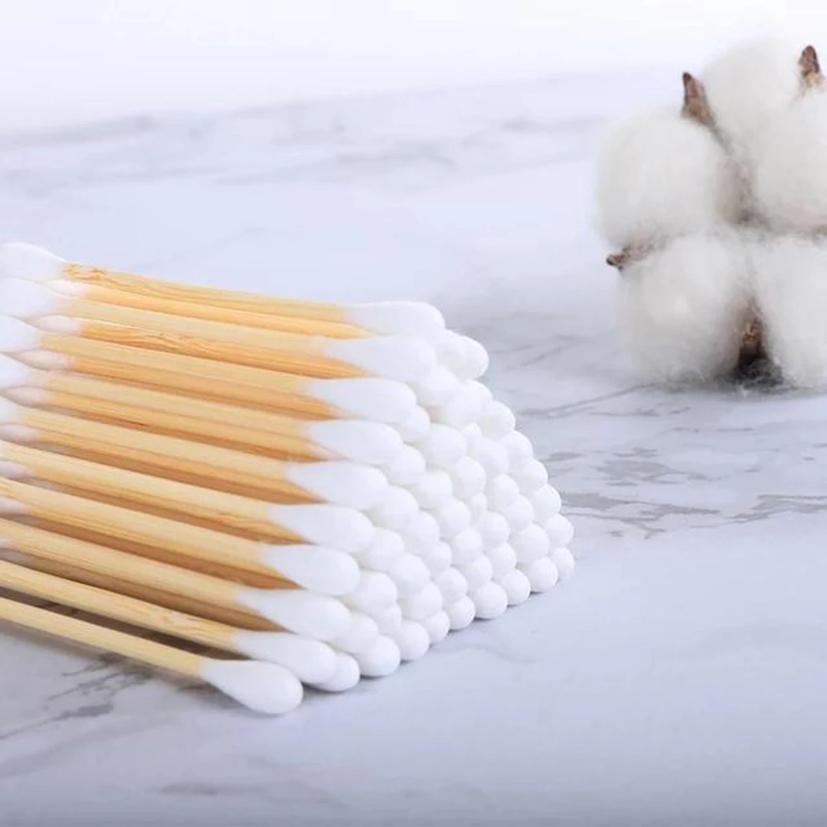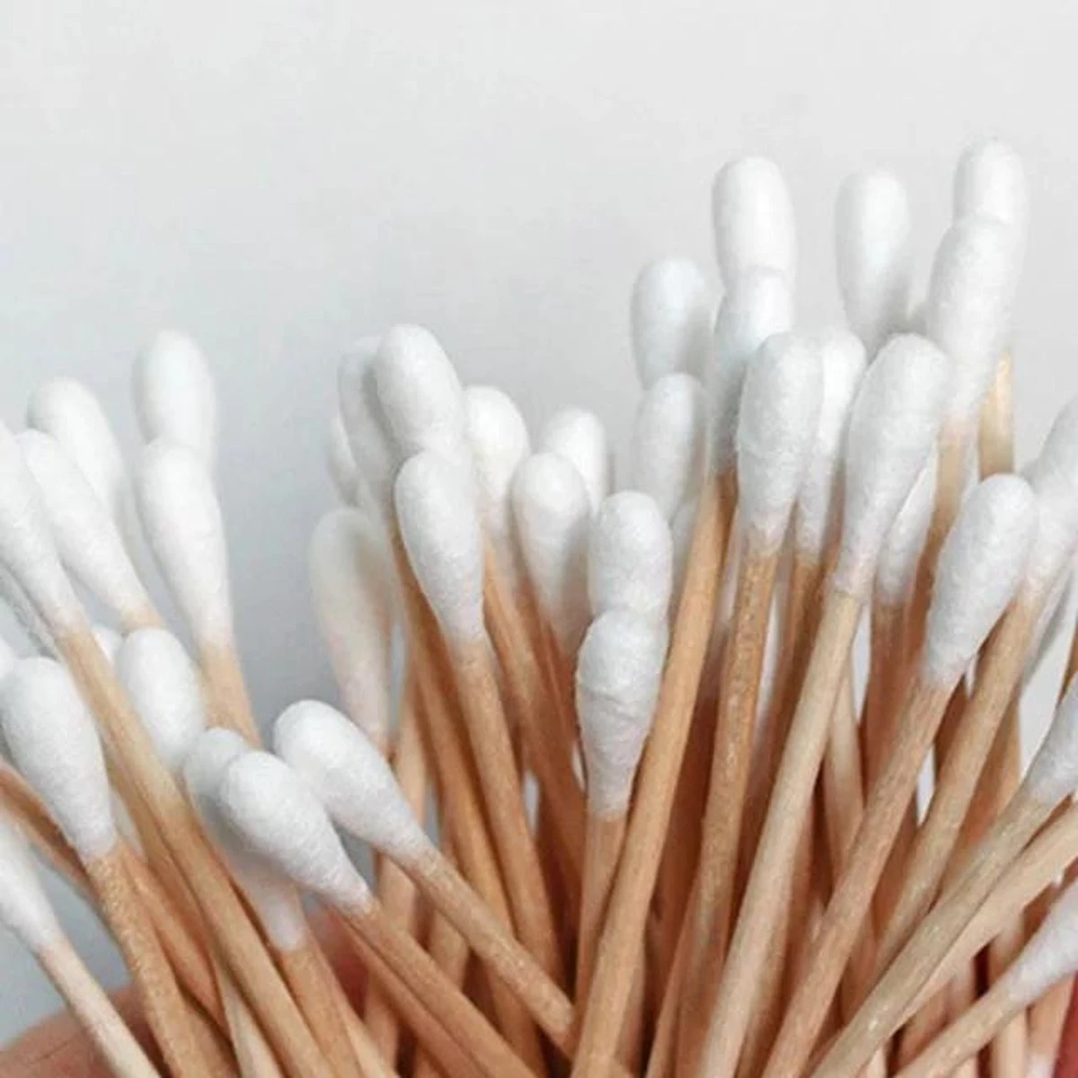 In deze verpakking zitten 2×100 houten wattenstaafjes.
