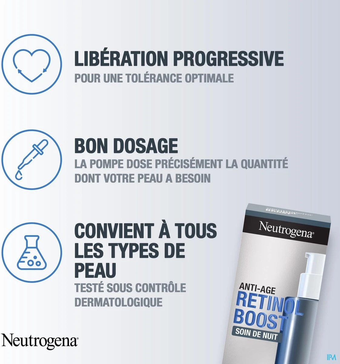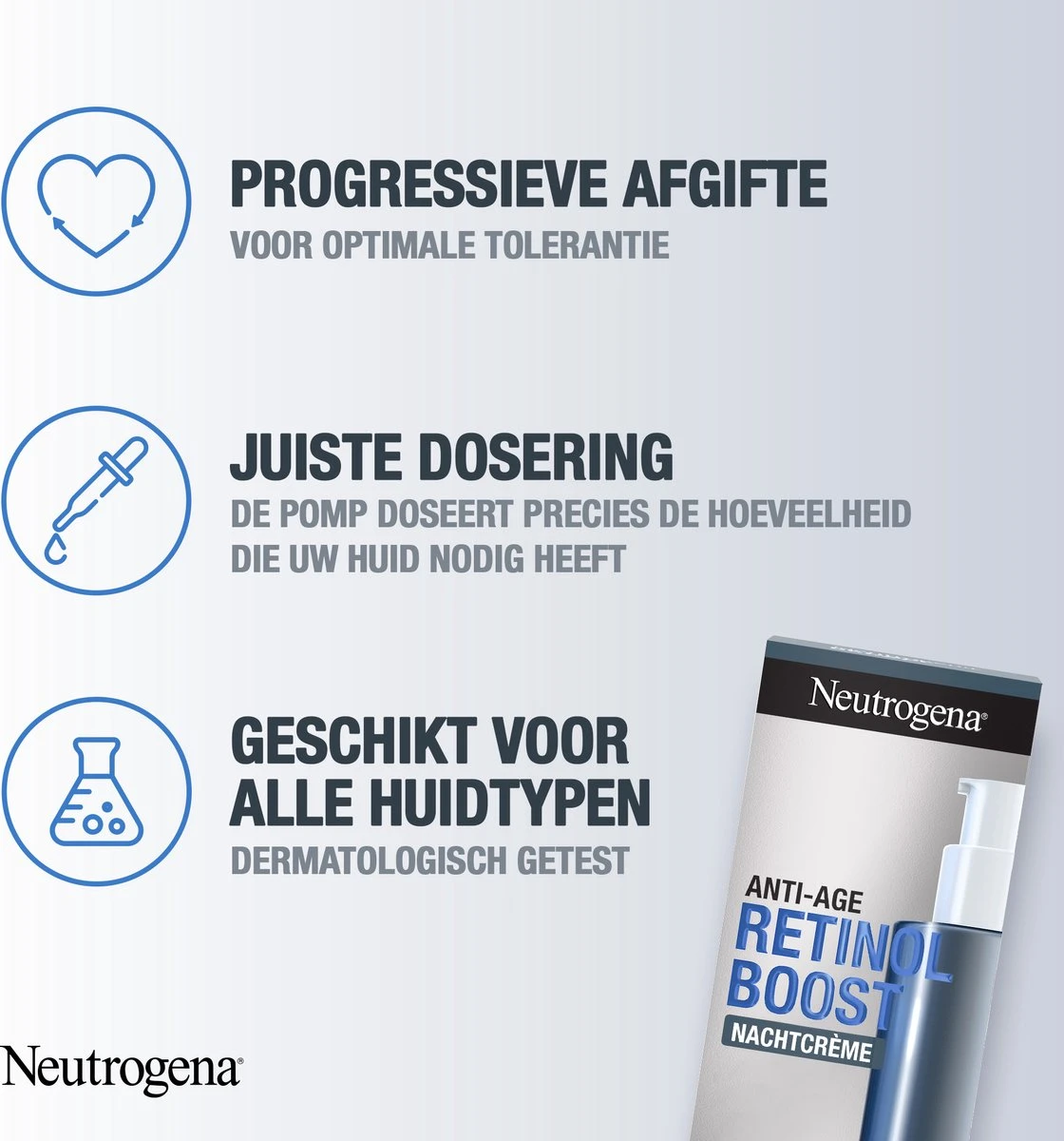 - Neutrogena Retinal Boost nachtcrème trekt snel in de huid en bestrijdt al na één week de zichtbare tekenen van huidveroudering: rimpels, verminderde stevigheid, vermoeide huid, droogheid en pigmentvlekken