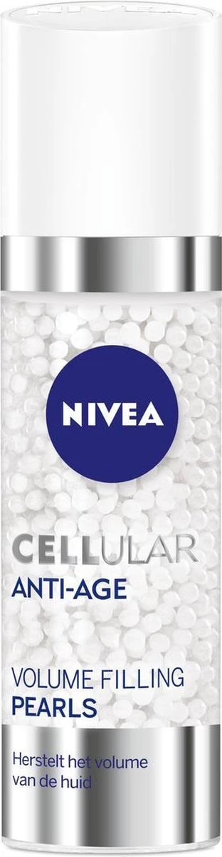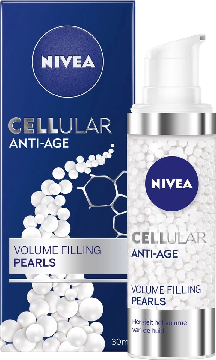 NIVEA CELLular Anti-Age Volume Filling Pearls geeft de huid weer volume. De innovatieve formule met krachtige anti-age ingrediënten zoals hyaluronzuur en collageenbooster maken de huid voller en steviger. Daarnaast stimuleert creatine cel vernieuwing waardoor de huid er jonger uitziet. De pearls bevatten de hoogste concentratie hyaluronzuur binnen de NIVEA CELLular lijn. De combinatie van ingrediënten vullen rimpels en geven de huid weer volume. De pearls worden direct geactiveerd bij één druk op het pompje. Breng dagelijks aan op een gereinigd gezicht. Het vormt de ideale basis voor dagcrème en make-up.
