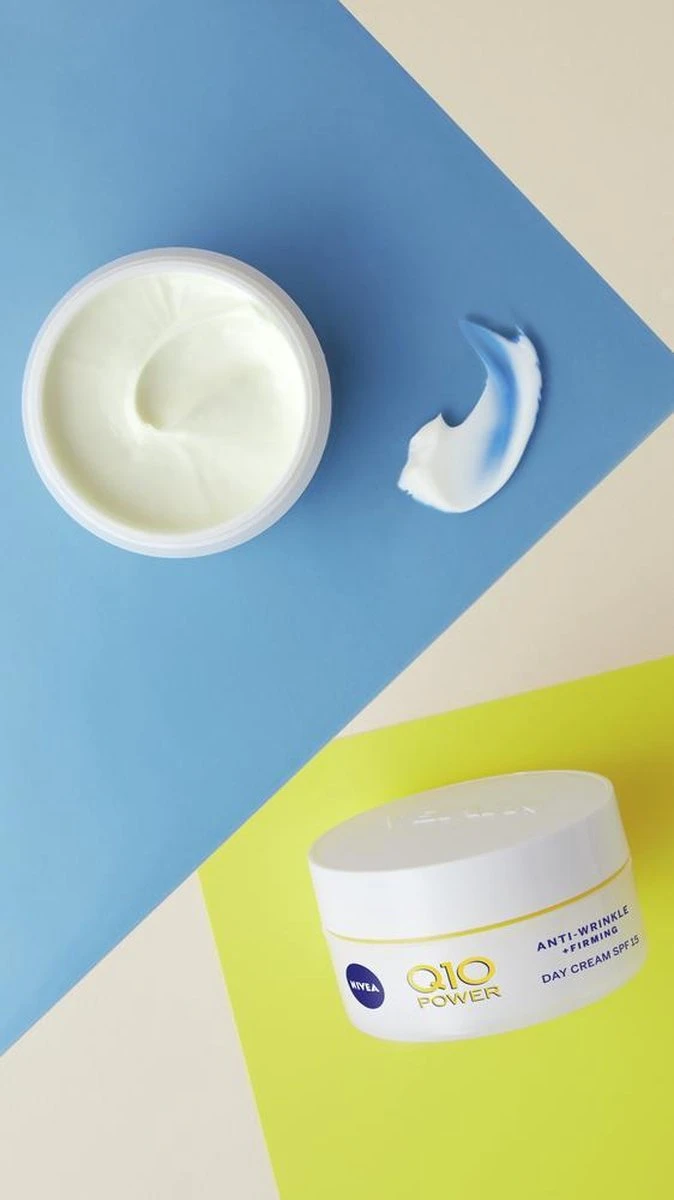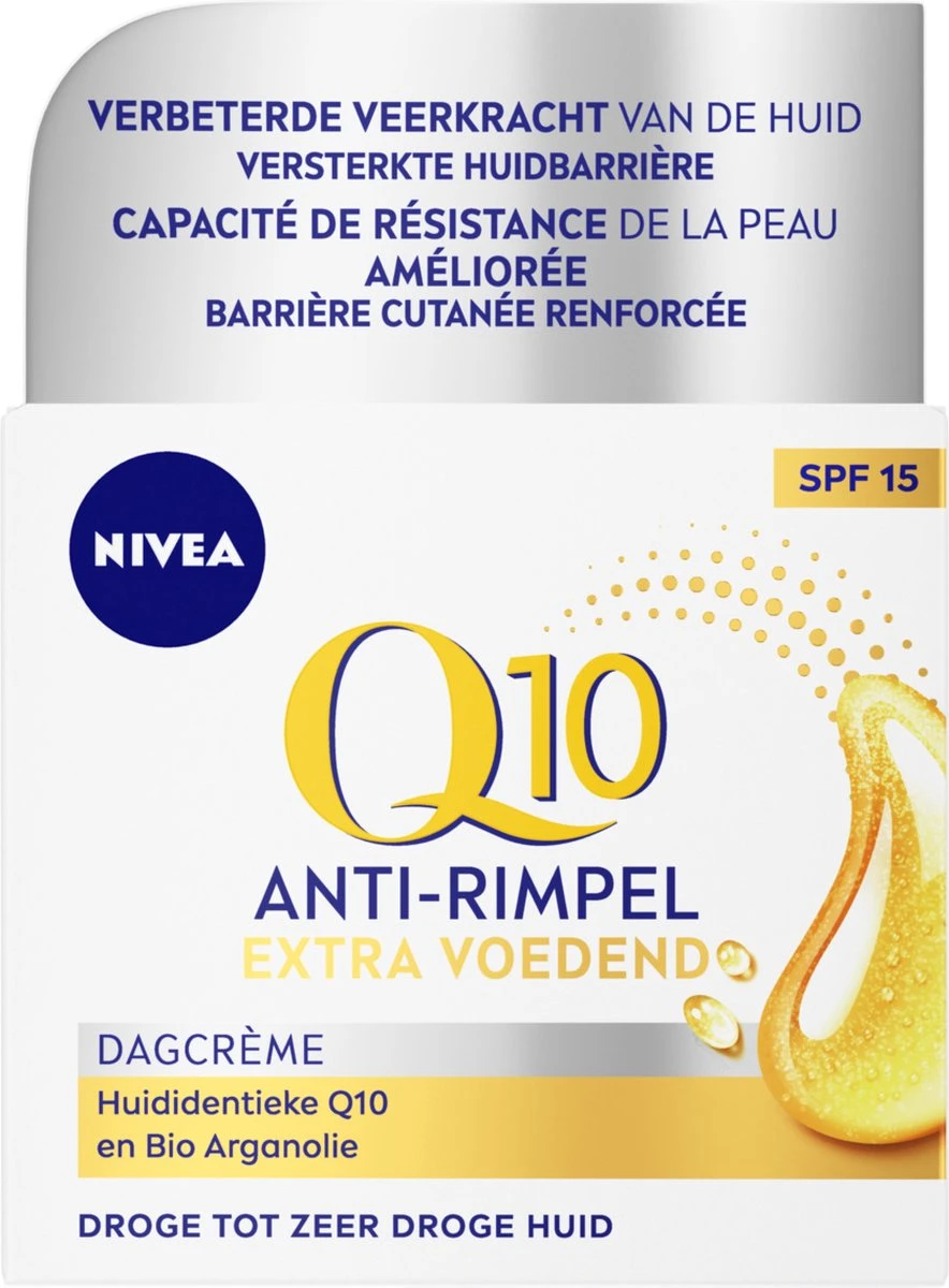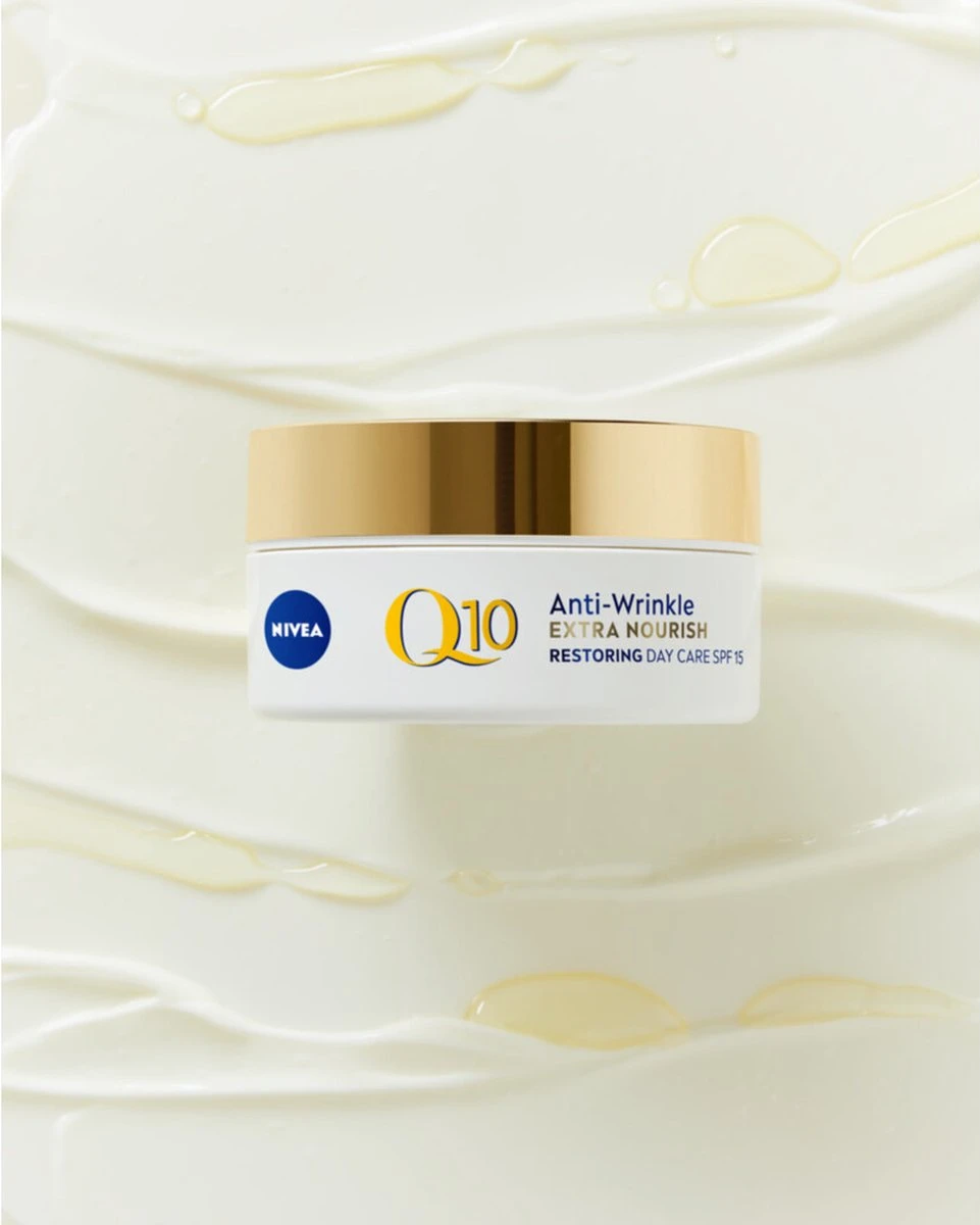 NIVEA Q10 Power +Extra Voedend: een dagcrème die je huid beschermt, extra energie geeft en het huidverouderingsproces bestrijdt. Het bevat Q10 die 100% identiek is aan het huideigen Q10. De dagcrème bevat Q10, Creatine en Arganolie. De Q10 remt de natuurlijke huidveroudering af en is een beschermende antioxidant, Creatine is een biologisch zuur dat huidverstevigende vezels stimuleert*. Arganolie heeft een voedende en verzachtende werking.