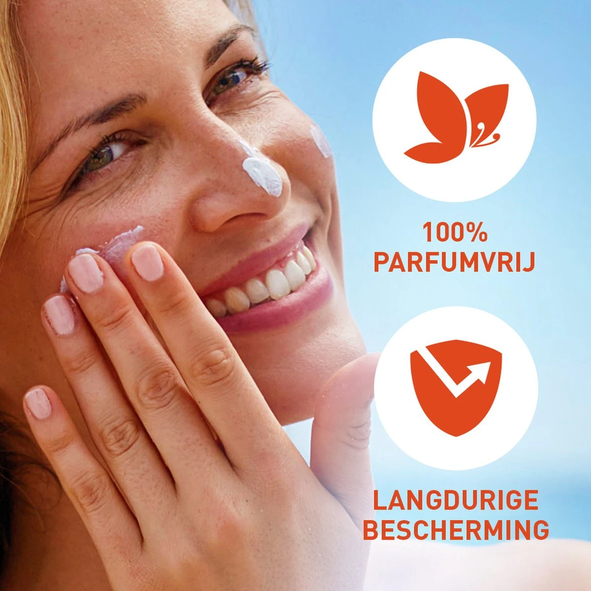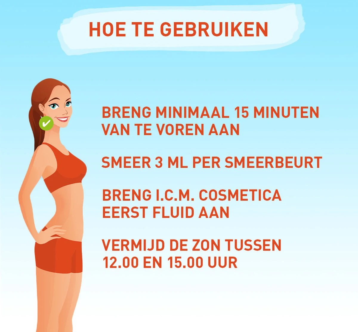 - 15-20 minuten voor blootstelling van de huid aan de zon royaal aanbrengen (ca. 3 ml op gezicht & hals per keer).