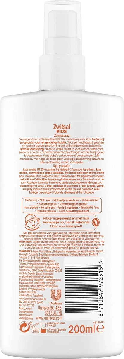 Zwitsal Zonnespray SPF 50+ is een parfumvrije, verzorgende en waterresistente zonnespray met hoge beschermingsfactor 50 voor je kindje. Het is makkelijk smeerbaar en plakt niet! Deze zonnespray met UVA/UVB filter is dermatologisch getest en hypoallergeen. Een handige pompflacon voor het gehele gezin. Voor een knuffelzacht gezichtje en huidje is goede bescherming ook bij lichte bewolking belangrijk. Gebruiksaanwijzing: Smeer je kindje royaal in voor je naar buiten gaat. Smeer om de 2 uur of na het zwemmen en afdrogen om het huidje goed te beschermen. Houd baby’s en kinderen uit de directe zon. Zelfs zonnebrandspray met hoge zonfactor biedt geen volledige bescherming. Bescherm extra met kleding en een zonnepetje. Smeer je kindje na een dag in de zon in met een voedende babybodylotion of aftersun.